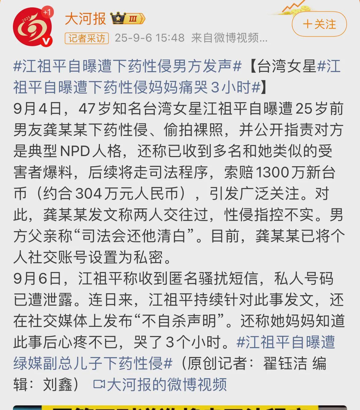 9月4日,江祖平再次发文称:不只一名女性受害,还有其他的女性长期饱受该名男子的骚扰,露骨信息和肢体触碰等等。