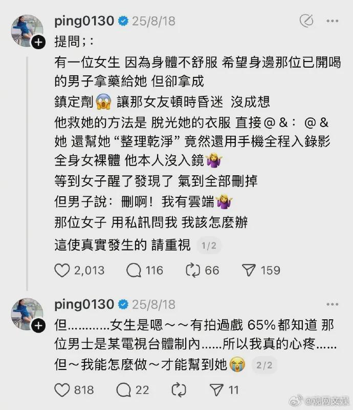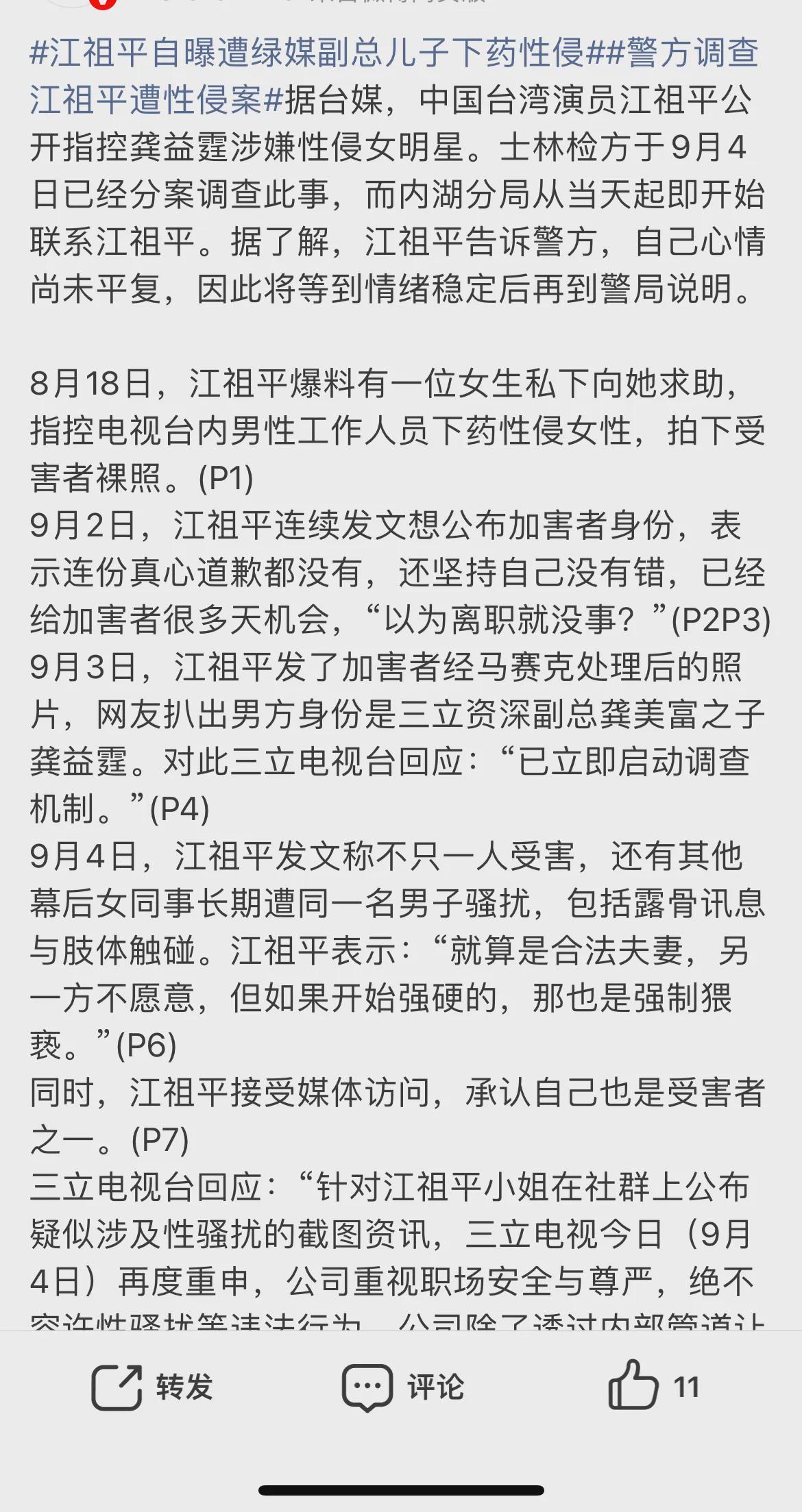 8月18日,江祖平爆料有一位女生私下向她求助,指控电视台内男性工作人员下药性侵女性,拍下受害者裸照。